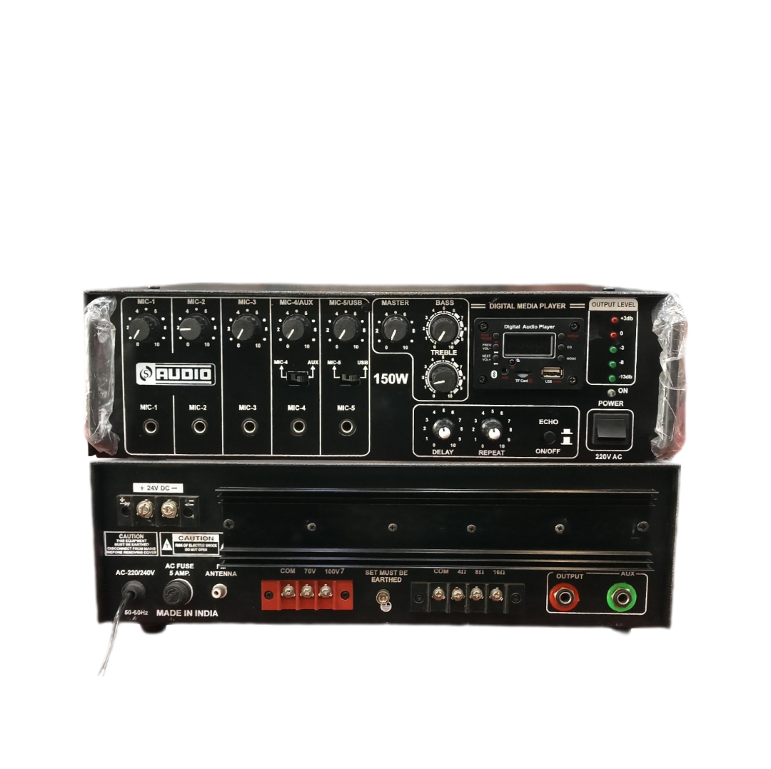 POWER OUTPUT — 57W RMS/ 65W MAX | SPEAKER OUTPUT — 4Ω, 8Ω, 16Ω, 100V | DIGITAL PLAYER — MP3 Player with USB, SD, | Blutooth and Remote | INPUT CHANNELS — LINE IN/OUT , 3 MIC, 2AUX | WITH ECHO | DC VOLT — 12V | DC VOLT — 12V