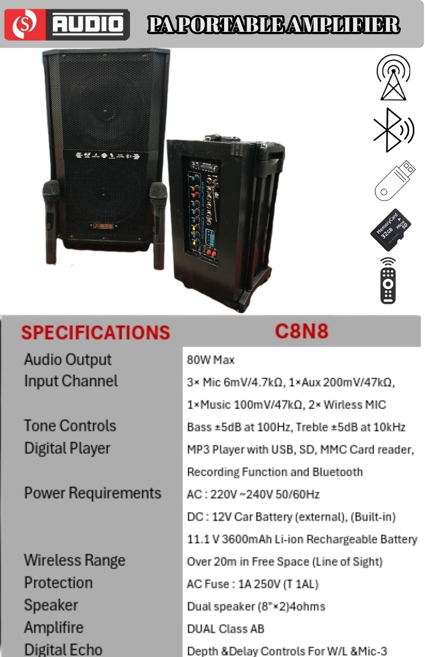 POWER OUTPUT — 80W RMS/ 120W MAX | DIGITAL PLAYER — MP3 Player with USB, SD, | Blutooth and Remote | INPUT CHANNELS — EXT. SPEAKER, 3 MIC, AUX | LINE OUT,WITH ECHO & CORDLESS MIC | POWER REQUIRE — DC : 12V (CAR BATTERY) | RECHARGEABLE BATTERY | SPEAKER — DUAL (8”×2) | SPEAKER — DUAL (8”×2)