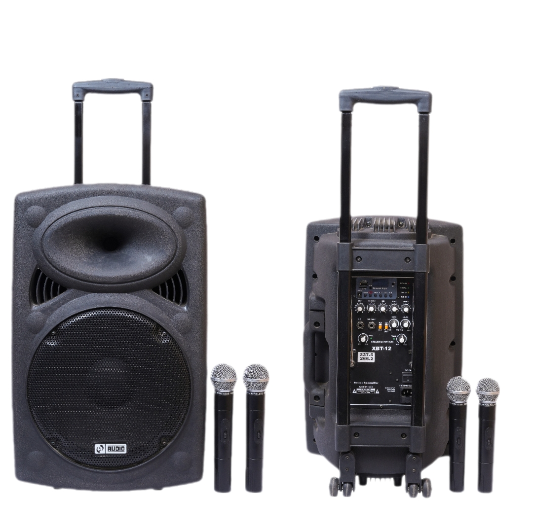 POWER OUTPUT — 250W RMS/ 400W MAX | DIGITAL PLAYER — MP3 Player with USB, SD, | Blutooth and Remote WITH 2 CORDLESS MIC | INPUT CHANNELS — 2 MIC, AUX, LINE OUT | WITH ECHO & RECORDING | POWER REQUIRE — DC : 12V (CAR BATTERY) | RECHARGEABLE BATTERY | SPEAKER — 12” LF | SPEAKER — 12” LF